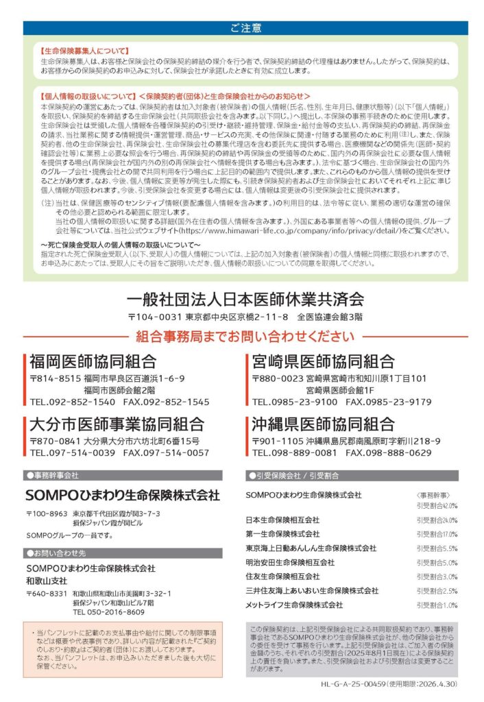 なお、加入方法や内容について、詳しくお聞きになりたい場合は、宮崎県医師協同組合へご連絡ください。