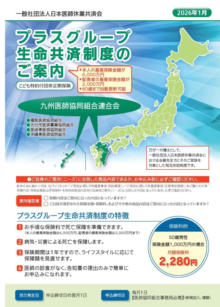 団体定期保険(日本医師休業共済会 プラスグループ生命共済)制度 ご加入のおすすめを未加入の組合員の方へ発送いたしました。